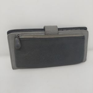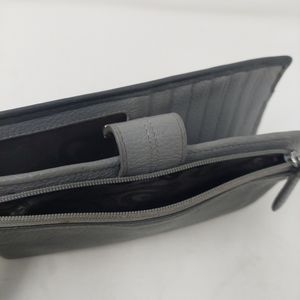 This Brighton Grey Pebbled Leather Barbados Large Pocket Wallet is in good used condition with a small pen mark on the front. This sophisticated grey pebbled leather designer wallet has a bifold style with a snap closure. This preppy leather wallet is made of colorblock style pebbled leather in light and dark grey tones and is perfect for everyday casual use.