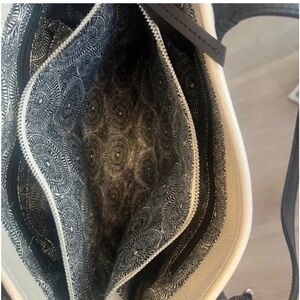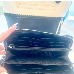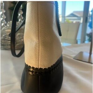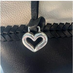 Great Christmas gift! Gorgeous and in excellent condition: Brighton Barbados Collection matching tote and wallet set in a timeless black and white leather combo. Crafted with signature Brighton attention to detail, this set features beautiful braided leather accents, pebble-grain texture, and the iconic silver heart charm. Tote Bag Features: • Pebbled leather in white and black • Signature Brighton silver heart charm • Braided leather trim • Zip-top closure • Interior: Printed lining with zip and slip pockets • Size: Approx. 11” H x 13” W x 4.5” D Wallet Features: • Coordinating black and white leather with braided detail • Zip-around closure with tassel pull • Back zip pocket • Multiple card slots inside