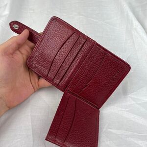 red leather, croc-embossed, heart charm, compact wallet, embossed pattern, accessory, romantic style, glossy finish, structured shape, statement piece