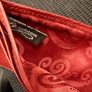 Stylish red card holder with crocodile embossing and heart detail. Perfect for organizing cards.