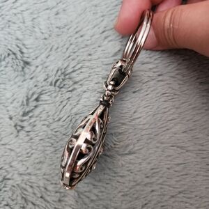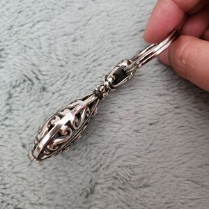 Beautiful silver keychain featuring an intricate design with sparkling rhinestone accents. Perfect for adding a touch of elegance to your keys. Description from Brighton website: Inspired by the exotic island of Bali and its master silver jewelry craftsmen, this key fob with openwork scrolls will make you dream of faraway places!