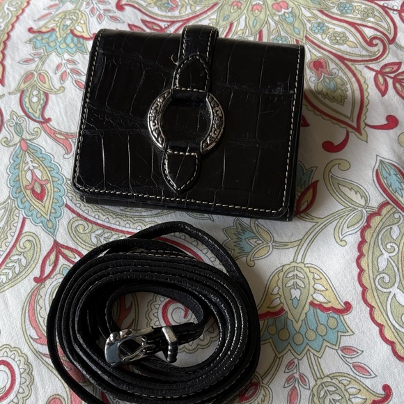 Elegant black embossed wallet paired with a sleek belt. Features detailed silver buckle.