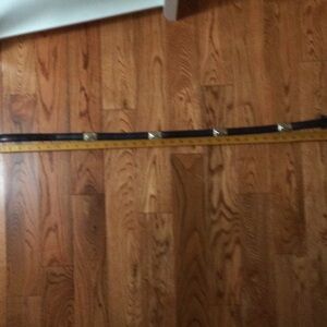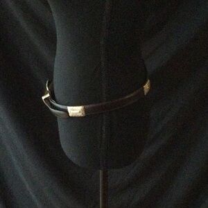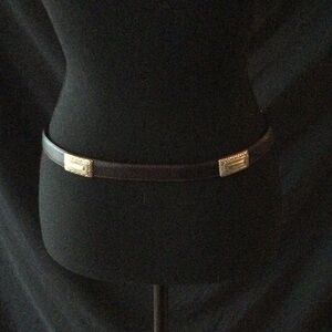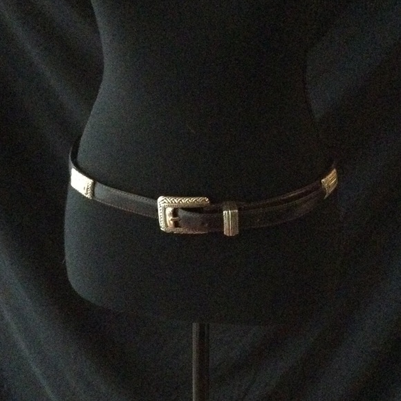Chic black leather belt with intricate silvertone buckle and accents.. Perfect for any outfit. slight scratch next to first silver accent. 39 inches with buckle.