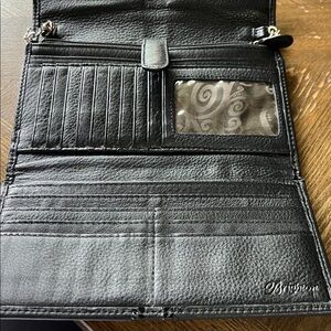 Elegant black leather clutch with removable crossbody bag featuring silver accents and decorative buttons. Absolutely beautiful and in pristine condition!