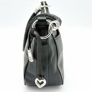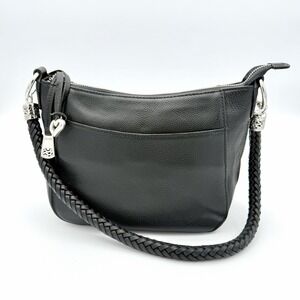 Discover your new go-to accessory with this elegant Brighton black leather shoulder bag. Its supple pebbled leather offers a luxurious feel, while the intricately braided strap adds a touch of sophisticated flair. The polished silver hardware, including a charming heart dangle, elevates its timeless appeal. Thoughtfully designed with exterior pockets for easy access, this bag is perfect.
