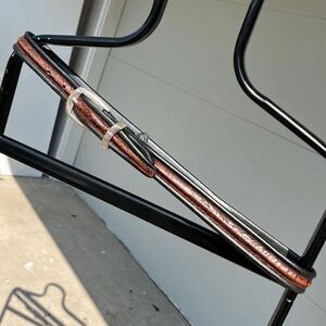 This timeless vintage Brighton belt combines black leather with brown croc-embossed detailing for a sophisticated, two-tone design. Featuring a silver-tone buckle and sturdy craftsmanship, this belt is both stylish and durable. Made in the USA, it’s perfect for cinching dresses, pairing with jeans, or accessorizing high-waisted skirts. The intricate croc pattern adds a touch of luxury, making it a must-have addition to any wardrobe. Unisex appeal. Very lightly preowned. Minor dents near holes. See photos.