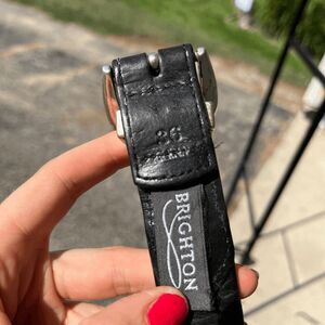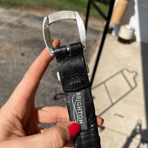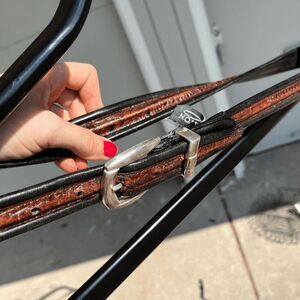 vintage belt, Brighton belt, croc-embossed leather, black and brown belt, silver buckle, minimalist accessories, classic style, timeless design, leather craftsmanship, American-made, retro fashion, luxury accessories, statement belt, preppy, equestrian aesthetic, polished look.