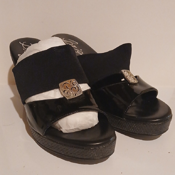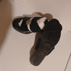 Elegant black mules with shiny patent leather finish. Features stylish silver accents. Perfect for a sophisticated look.