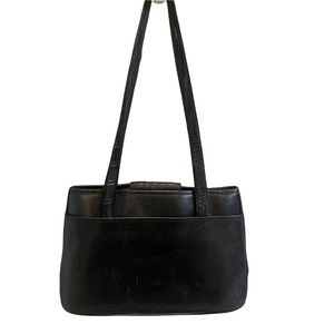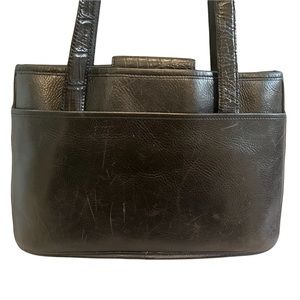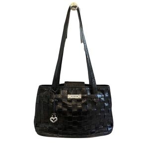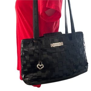 Black weaved leather shoulder bag by Brighton closes with a magnet snap and has a large exterior slip pocket on the back of the bag. Interior has 3 slip pockets and a zippered pocket as well. The front of the bag features leather strips in a basket weave pattern; the back is solid black leather. Double shoulder straps. Interior is lined with plaid cloth. The rectangular silver charm on the front as well as heart charm has some tarnished areas
