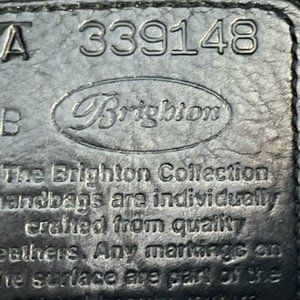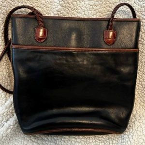 Elegant Brighton tote with heart charms. Features braided straps. Stylish black and brown design.
