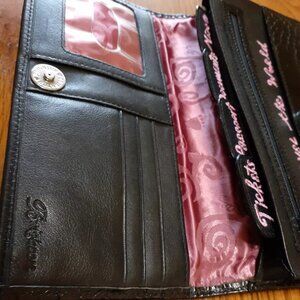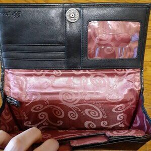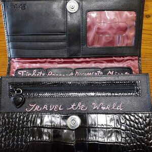 Elegant black wallet with pink interior. Features multiple card slots and compartments. Stylish and functional design.