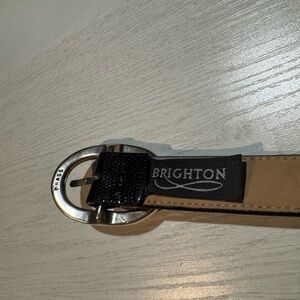 This Brighton belt showcases a timeless blend of black and tan leather, offering a versatile accessory for any wardrobe. The belt features a classic oval-shaped metal buckle, adding a touch of elegance to its traditional design. Crafted with attention to detail, it is perfect for both casual and formal occasions.