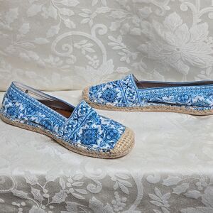Experience the perfect blend of style and comfort with Brighton's blue espadrilles. Featuring a vibrant floral print on a canvas upper, these slip-on shoes are ideal for casual summer outings. The traditional jute-wrapped sole adds a touch of classic charm to your everyday look. Some staining in left inside see pic