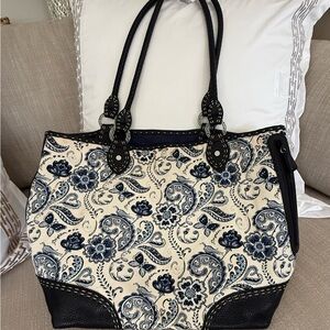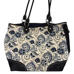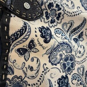 Chic tote with floral pattern. Sturdy black handles. Spacious and stylish. 2 ways to carry it’s a denim bag, and a floral bag ! Beautiful in like new condition. This bag is so versatile would make a great baby bag gym bag worked out throw your laptop in throw your school papers in to use this bag in so many ways.
