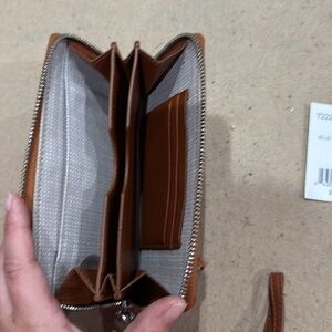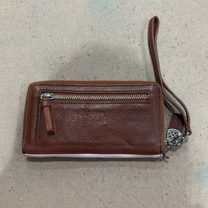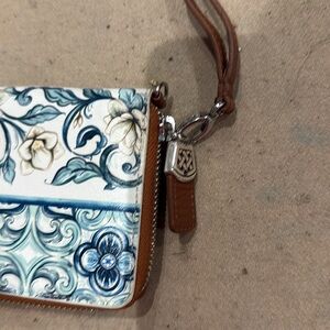 Chic wristlet with floral patterns. Blue and white design. Brown strap for easy carrying. Perfect for essentials.