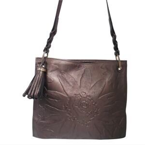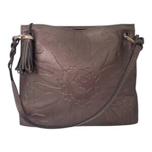 Brighton Bronze Metallic Leather Embossed Flower Tassel Shoulder Bag New!