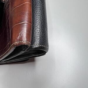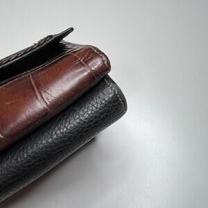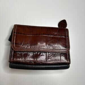 Stylish two-tone clutch wallet by Brighton featuring textured black leather with croc-embossed dark brown accents. Zip-top compartment and flap front pocket with heart-shaped snap closure. Interior lined with Brighton’s signature print. Great vintage condition with minor wear consistent with age.