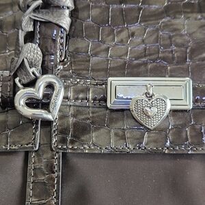 Stylish women's backpack with crocodile-patterned accents. Features heart charm details. Perfect for chic everyday use.