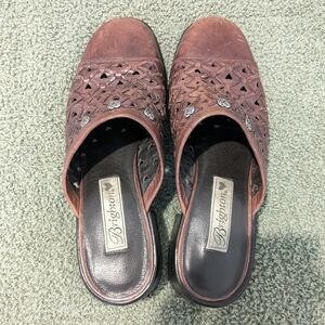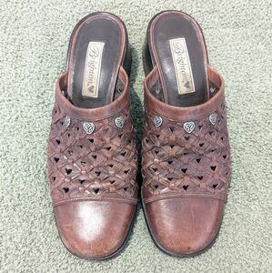 Brighton Brown Heart Cut-Out Leather Slip-On Heeled Mules Fanny Artsy Boho Bohemian Festival.