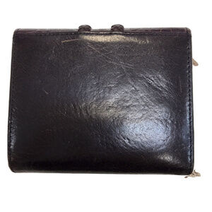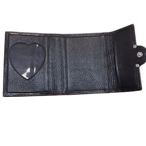This lovely brown and black leather embossed ID holder features brushed silver accents, a flap snap closure, black leather interior lining that includes 1 credit card slot and 1 heart-shaped ID holder.