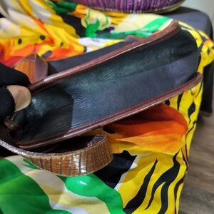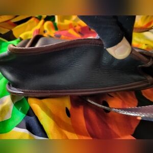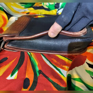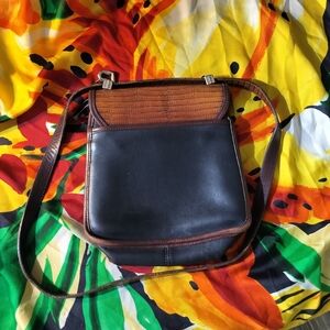This crossbody bag by Brighton combines brown and black leather for a timeless look. It features a structured, trapezoidal design and a metal emblem on the front. In perfect condition.