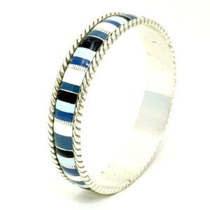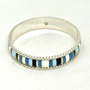Brighton silver tone bangle showcases a vibrant striped enamel design with fancy silver tone edging. Very solid and well made bracelet. There are a few inner marks on the silver, but the outer enamel is in great overall condition. Has a 2.5" inner diameter.