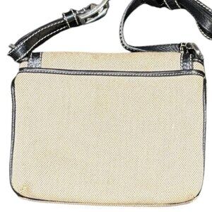 Tan canvas with Brown Leather Croc embossed trim/front pocket. Silver tone etched hardware.
