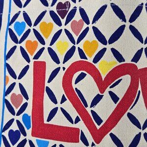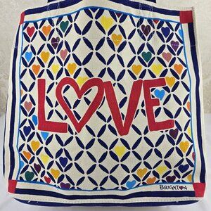 Colorful canvas tote bag from Brighton. Double handles in blue. The front reads "LOVE" with red against a full colorful pattern. The back reads "Love" in a colorful heart. The bottom reads " Keep love in your heart!". The interior has a large open compartment. The attached zip pocket that has two flamingos below the words "A pocket full of love!". Easily packable and lightweight.