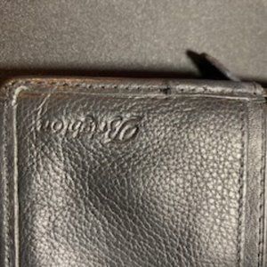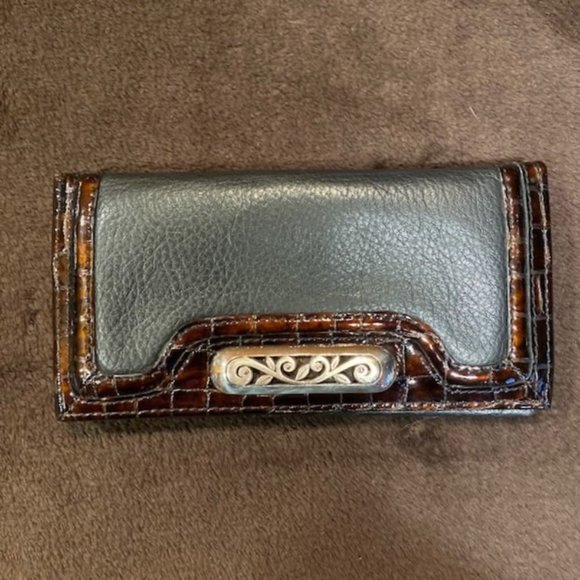 One of Brighton's most popular wallets. It has 14 card slots with an ID clear view window. Gently used, non-smoking & very little wear on the silver emblem (photo provided). Soft, supple leather complemented with snakeskin brown shiny trim. Zippered center pocket that will hold up to a phone the size of the iPhone 14 Pro! Love this wallet- it is a value buy. Brighton never goes out of style!