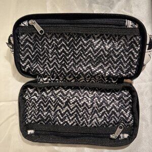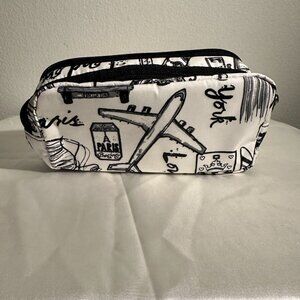Stylish and compact! This Brighton cosmetic bag features a chic black-and-white London travel print with iconic details like bicycles, umbrellas, and city stamps — finished with Brighton’s signature silver heart logo accent. Perfect for makeup, travel, or everyday essentials.
