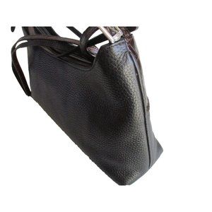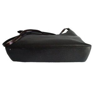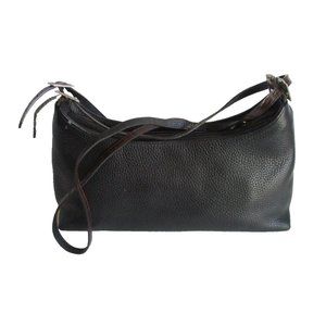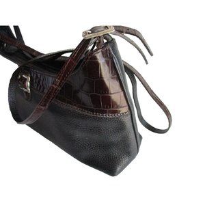 Classic! Brighton crossbody black pebbled base with chestnut brown patent croc border and mock buckle. Width:12 in, Height:5 in, Depth:3 in. 3/8 inch wide adjustable strap with 20 inch drop. Interior zipper compartment. Signature stamped silver hardware. Signature leather heart logo. All measurements are approximate. 0125 (P24-10)
