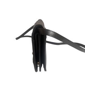 Made of black woven leather on the exterior flap with smooth black leather body and Removable cross body strap