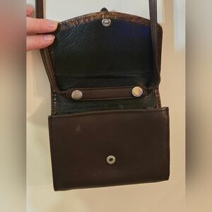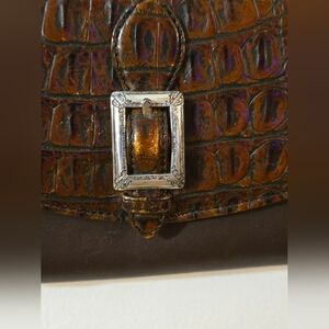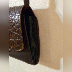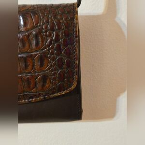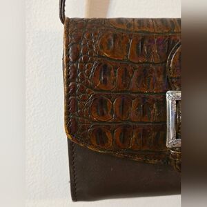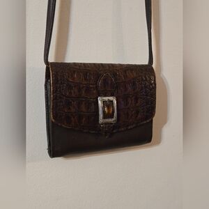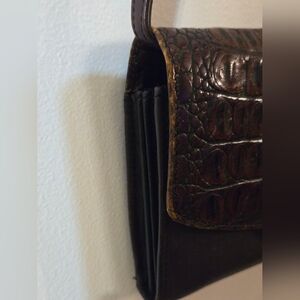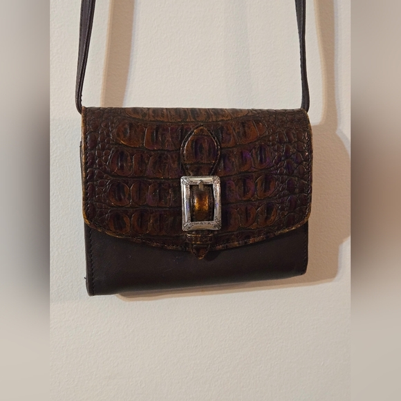 Brighton black leather with brown crocodile-embossed leather design feature classic Brighton silver accent. Crossbody strap with wallet features. Used condition. See photos for details.