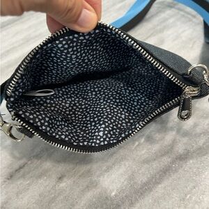 Add a touch of elegance to your outfit with this black and blue crossbody bag, adorned with a beautiful butterfly design. Ideal for any occasion.