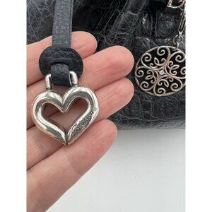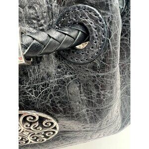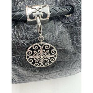 Absolutely gorgeous vintage Brighton bag! Dark charcoal gray faux croc and pebbled leather combination, drawstring shoulder bag with woven braided handles. Beautiful 1.5" diameter silver filigree disk with center rhinestone detail. Bright floral MCM fabric lining. Measures 10" x 13" x 4". 3 inside pockets, magnetic closure. 14" drop. Excellent condition both inside and out.