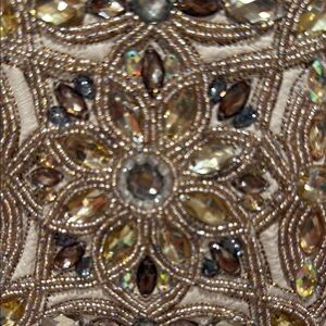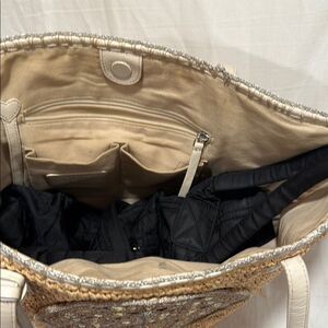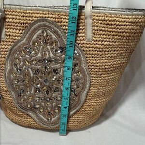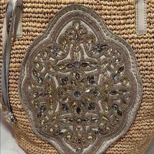 Stylish Brighton woven tote bag in tan with intricate embellishments. Perfect for any occasion.