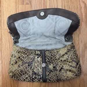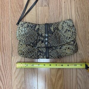 Excellent used condition, gray embossed interior with zip pocket, silver hardware, detachable wristlet strap