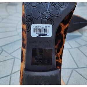 NWOT: Stylish, "Eve" calf hair/leather trim upper flats/pumps with a leopard print / pointed toe / low block heel / silver tone decorative bar accent by Brighton. Made in Brazil.