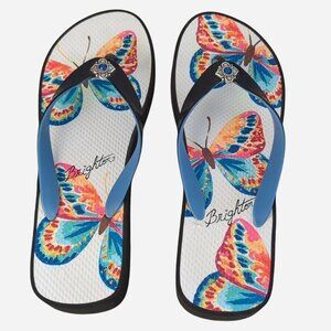 Add a burst of color and whimsy to your summer style with these Brighton “Flit” Butterfly Platform Flip Flops. Featuring vivid rainbow butterfly prints on a white footbed, glossy blue straps, and Brighton’s signature silver-tone medallion accents, these sandals blend comfort with playful charm. Lightweight and perfect for beach days, vacations, or everyday wear.