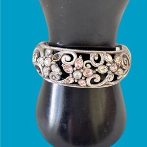 This elegant silver bracelet features intricate floral designs with sparkling accents. Perfect for adding a touch of sophistication to any outfit.
