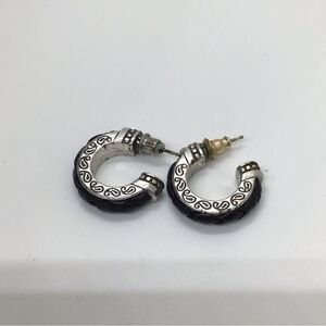 Classic design black enameled and silver tone necklace and bracelet. Black leather twist earring on silver tones small hoops.