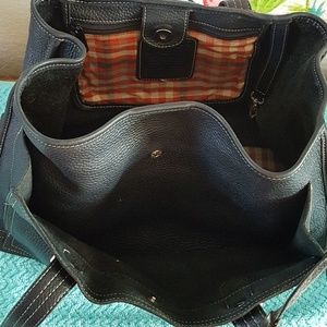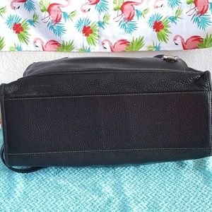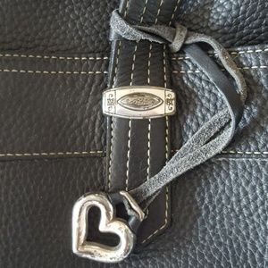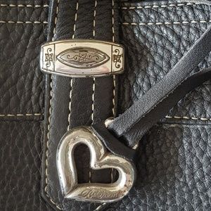 This vintage Brighton handbag is a great bag. It's the perfect size if you need to take along your iPad or a diaper and wipes! It is in very good condition. The heart, which is removable, and the emblems at the base of the handles do have some tarnish. Measures approximately 14 1/2" w x 9 1/2"h x 5 1/2" d and handles are 13".