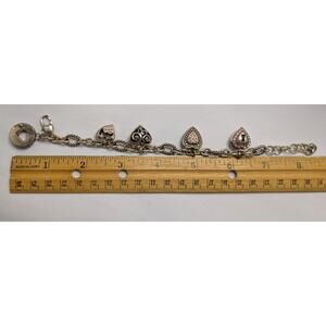 This charming Brighton bracelet features a whimsical design of heart-shaped charms adorned with pink crystals, set on a silver-tone chain. The bracelet measures approximately 7.5 inches in length, making it an ideal size for most wrists. Each heart charm showcases intricate detailing, including a keyhole motif, swirls, and stud accents, adding a playful yet elegant touch to this collectible piece.