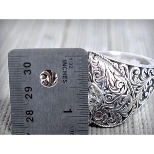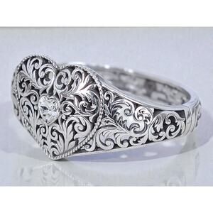 Beautiful vintage Brighton statement bracelet featuring intricate heart filigree design with hinged clamper style. Magnetic closure for easy on and off. Silver plated retired design perfect for Brighton collectors, heart jewelry lovers, statement cuff enthusiasts, or anyone who appreciates romantic filigree jewelry. Good condition with some normal wear. Fits approximately 7 inch wrist.