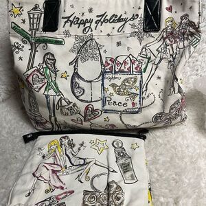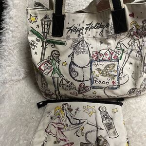 Brighton Holiday City Tote &Cosmetic Pouch cotton Canvas beige multi color print