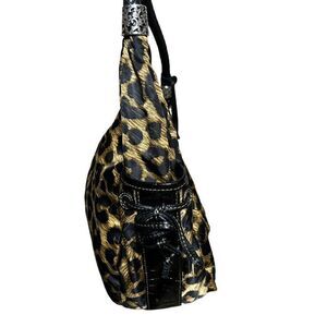 Beautiful, leopard canvas, hobo style shoulder bag with leather trim and braided handle. Features Silver hardware, pockets on each end, leather bottom, beautiful red signature, lining, the Brighton, creed, signature, key fob, inside has a zippered pocket with two slide pockets. Comes with matching eyeglass case. Bag measures approximately 15" wide, 11" tall, and 4" deep. Be sure to check out all of my other Brighton bags!
