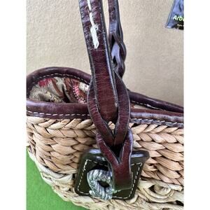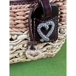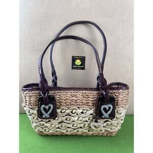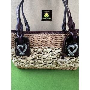 Brighton Vintage Jute, straw and leather handbag - So many beautiful details ! Beautifully woven Jute and straw creatibg a pattern, lined with waTer repellant fabric in a olde tyme floral pattern, Accented with metal braid hearts and leather , heart charm covered in Jute also. Beautiful and not a typical bag - no top closure : on purpose ! it is closes almost completely on top but is designed to not have a proper closure - I dont reccomend this as a primary purse :). it certainly is cute though and quite a conversation piece ! Please see my pictured measurements . Thank you for your consideration if this beautifully unique bag by Brighton!