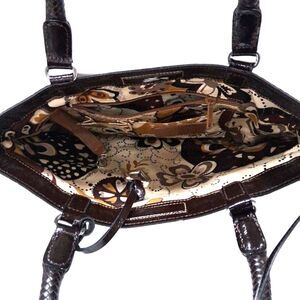 Brighton dark brown, croc embossed patent leather Kaelan Pocket tote/shoulder/crossbody bag in excellent condition. Beautiful silver hardware with convertible straps for shoulder or crossbody wear. Measures approx 11.25H x 11 x 3.25 inches. Has two 6 inch drop braided handles and a removable long strap. The interior has one zip compartment and storage pockets. Magnetic snap closure.