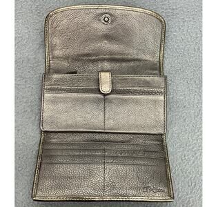 This Brighton wallet is gorgeous! This large bronze pebbled leather tri-fold wallet features a silver medallion and plenty of space for all your cards and cash.