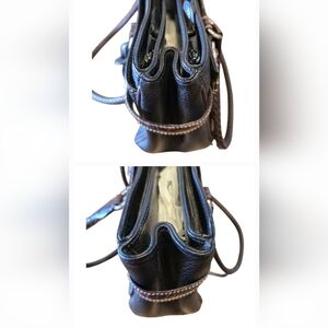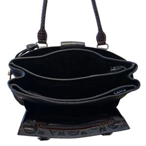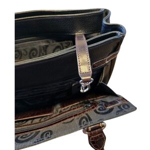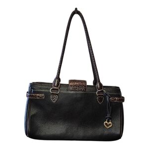 Brighton Laverne retired black and brown pebbled leather shoulder bag. Multiple compartments to keep you organized, silvertone hardware, braided handles, magnetic flap over clasp accented with a silver heart. Signature black logo fabric lining. Excellent used condition.